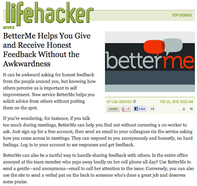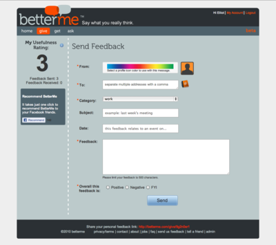 BetterMe was a platform that allowed anyone to give or receive feedback about anyone else. While preserving anonymity, BetterMe's site also allowed interaction between the giver and receiver so that questions could be answered and clarifications provided.