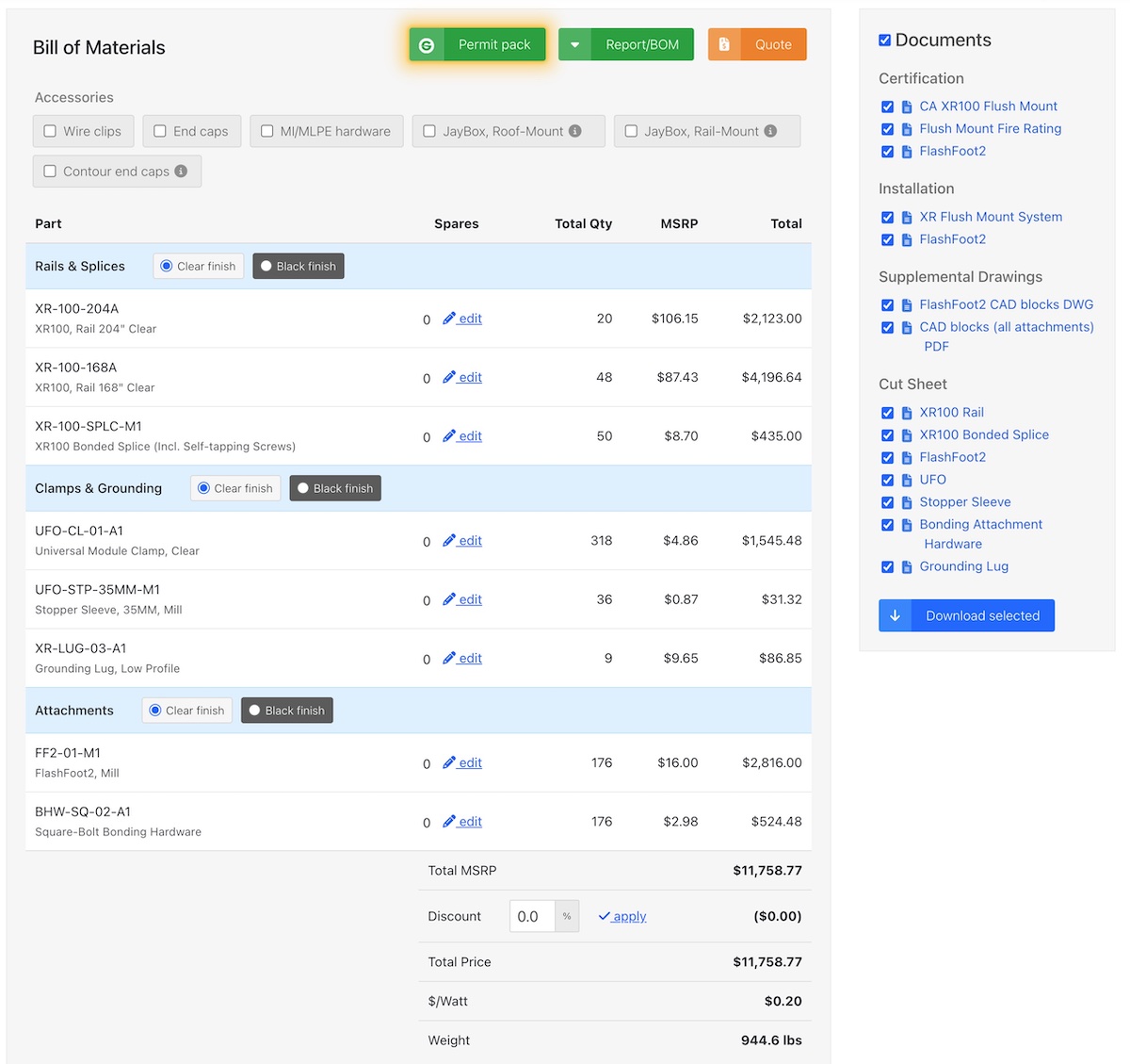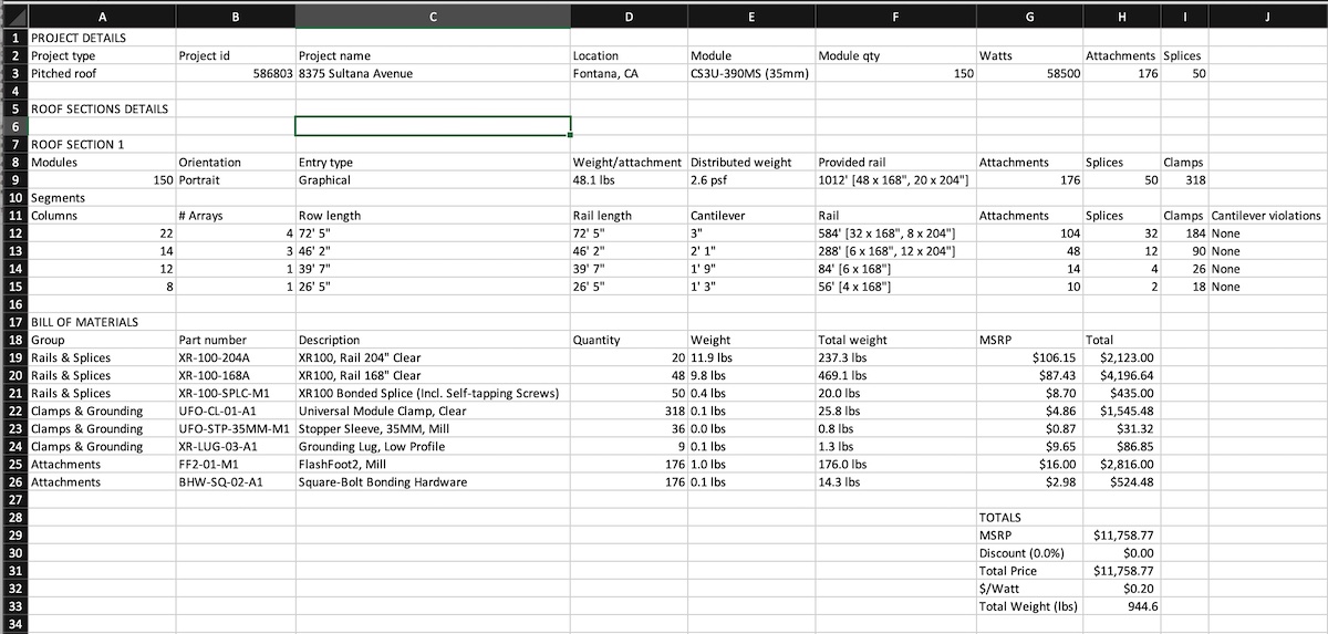The Design Assistants™ then calculate all the engineering loads and Bill of Materials/cost for the installation. The installer can also easily "what if" and see how changes in panels, spans, or other criteria affect the loads and costs of the system.